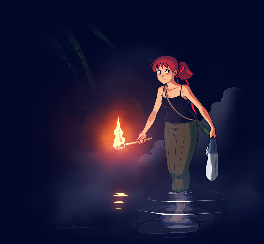 Concept art of Luna exploring the city core under Rose City.